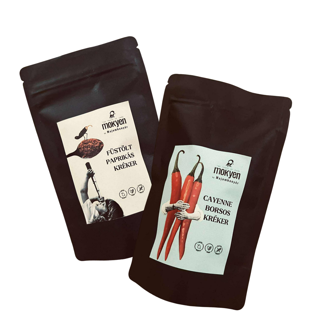 sós krékerek 3 ízben (fokhagymás, cayanne borsos, füstölt paprikás). A finomságok egyik alapja a cirokliszt,ami rostban és antioxidánsokban